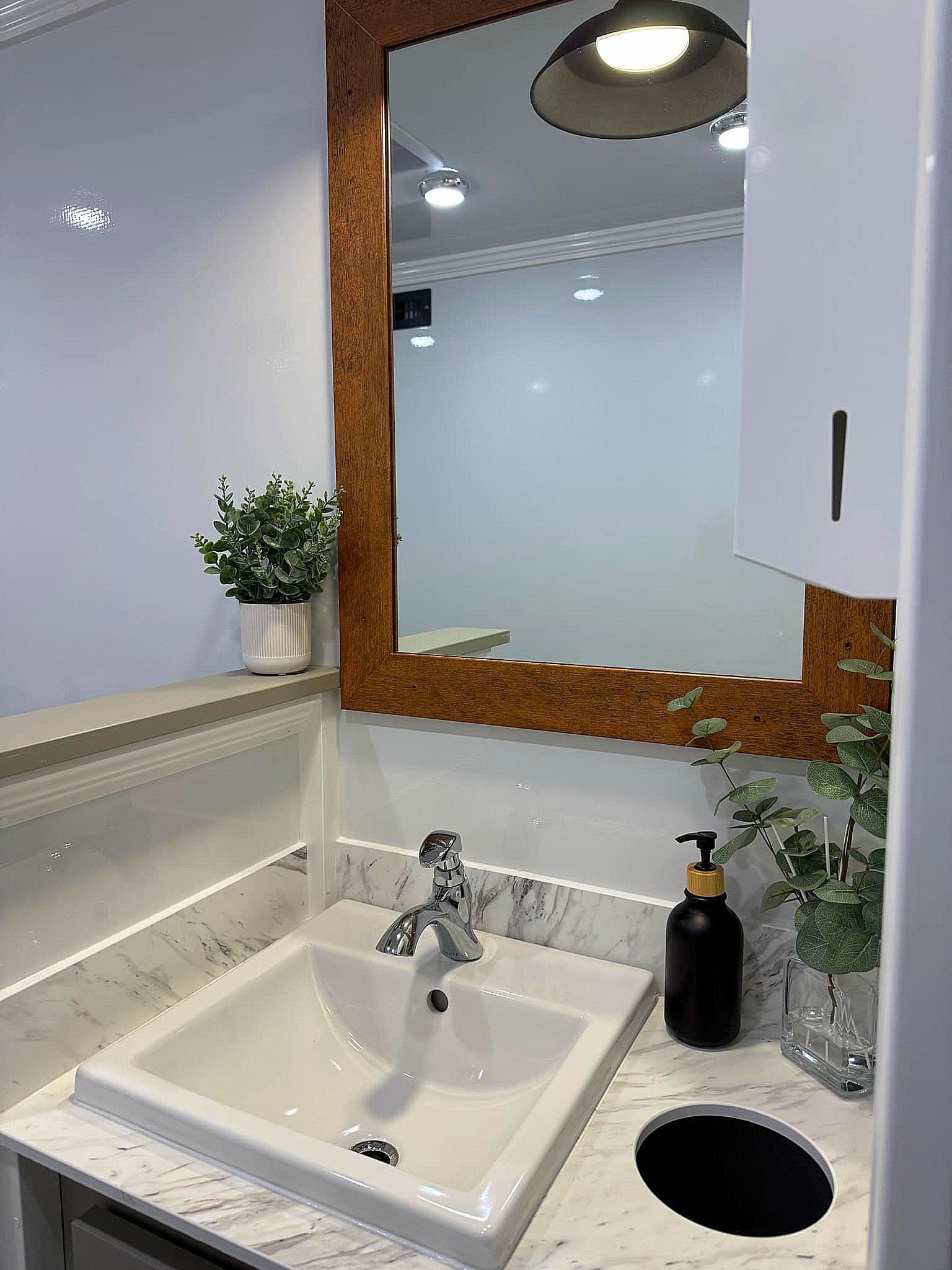 Treat your guests to the best with our 3 station Luxury Restroom Trailer. This high-end trailer is outfitted with decorative flooring, upgraded lighting, crown molding trim, and much more. Our luxury model trailers are excellent for wedding venues, wineries, corporate events, businesses, and countless other special occasions.